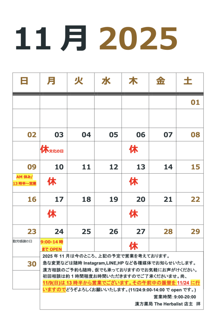 【2025.11月の営業スケジュール|世田谷区の漢方薬局 The Herbalist】※11/8更新