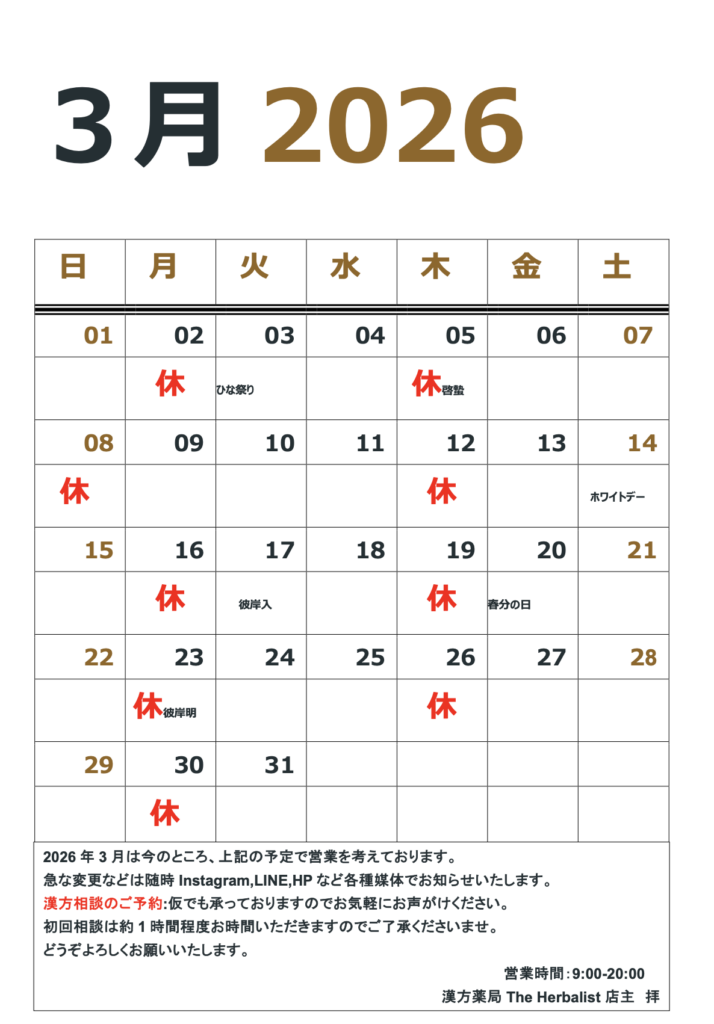 【2026.3月の営業スケジュールと各種営業面での変更点の報告|世田谷区の漢方薬局 The Herbalist】